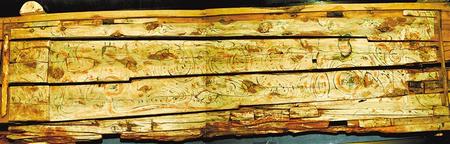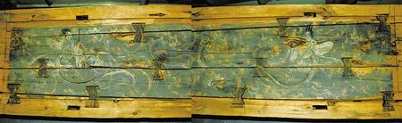 1998年新城魏晉南墓出土。這副完整的木棺由棺身和棺蓋組成,棺蓋內側有一長方形凹面,內彩繪伏羲女媧圖。伏羲女媧人首蛇身,兩尾相交,伏羲在右,左手執矩,女媧在左,右手執規。伏羲女媧周圍飾云氣紋。棺身呈長方體,兩檔頭用墨線勾畫星象圖,棺內側四壁彩繪幃帳、絹帛、蠶繭等圖形。