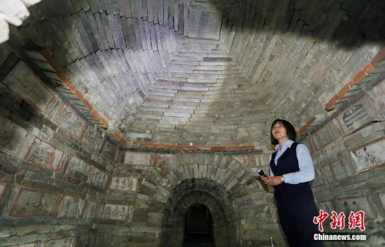 位于甘肅嘉峪關(guān)市的嘉峪關(guān)新城魏晉墓群,內(nèi)有千余座魏晉古墓,從1972年起,先后發(fā)掘18座,其中9座為畫像磚墓。磚壁畫取材于現(xiàn)實(shí)生活,用連環(huán)畫的方式反映出了當(dāng)時(shí)河西地區(qū)生活、生產(chǎn)、軍事、文化的真實(shí)情景,具有濃厚的生活氣息。目前只開放的六號(hào)墓,其壁畫內(nèi)容豐富,具有很強(qiáng)的代表性。高展 攝