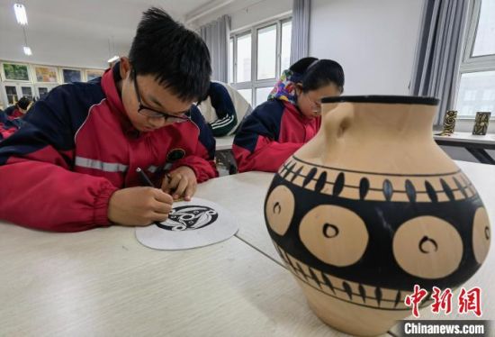 近日,中新社中新網記者走進蘭州市第三中學“彩陶”課堂,學生正在繪制彩陶圖案。 劉玉桃 攝