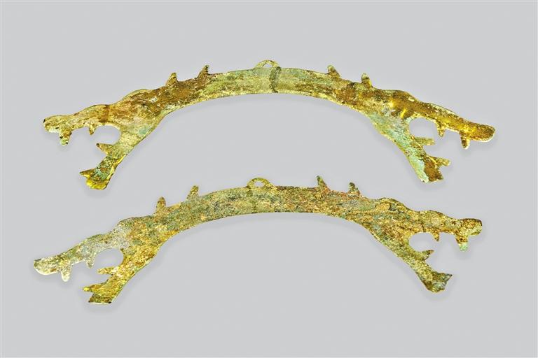 此套鎏金龍虎飾件中的虎飾件:長36.1厘米,寬9厘米;龍飾件:長41厘米、寬7.7厘米。為春秋戰國時期龍、虎形銅璜,圓拱形,頂部之上有拱形穿,兩端分別為龍首與虎首,口部張開,露出尖牙。在新石器時代,璜一般是佩戴于胸頸部的裝飾品,具有象征身份地位的作用。