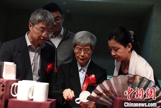 2018年8月,樊錦詩(中)在莫高窟數字陳列中心參觀文創產品。(資料圖) 楊艷敏 攝