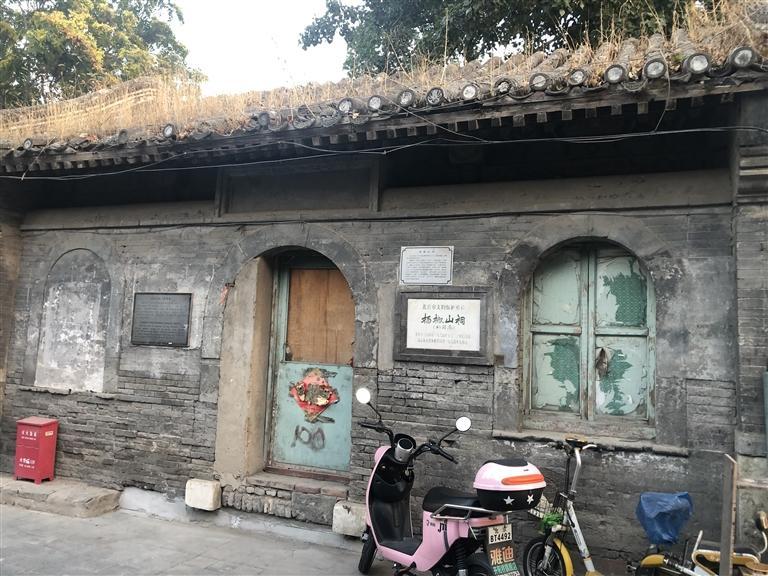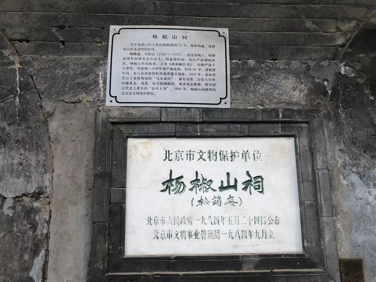 就是在這個胡同里,我看到一個歇山式屋頂?shù)姆课荩严喈?dāng)?shù)钠茢。蓓斏祥L滿了凄凄荒草,門窗皆已破爛不堪。但是門旁的墻壁上卻鑲嵌著一塊匾,近前一看,上面寫著“楊椒山祠”。喲,這就是楊椒山在北京的祠。