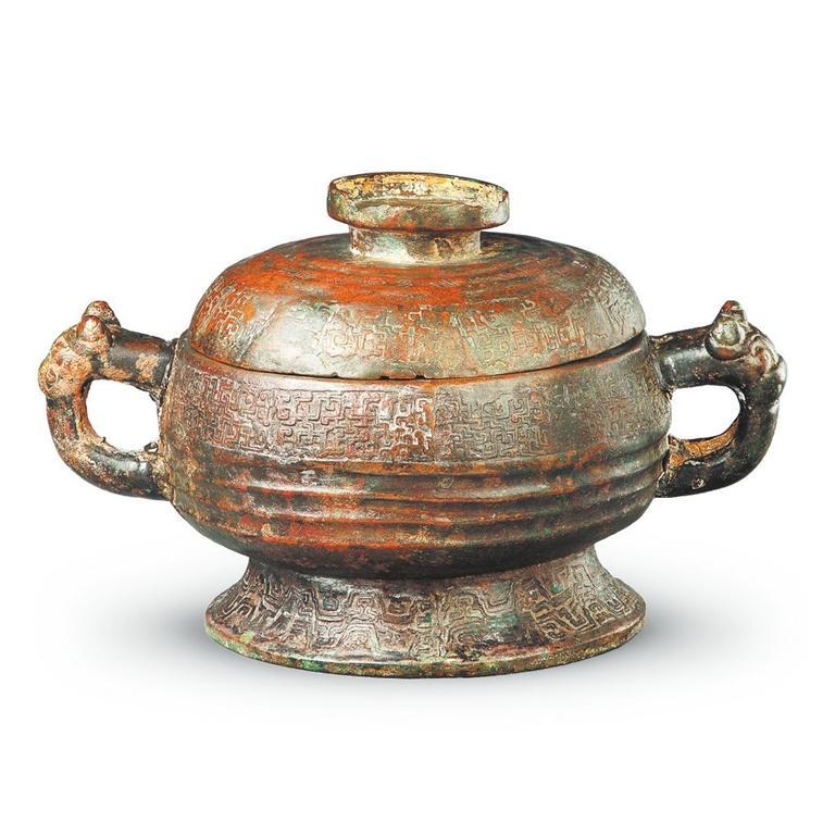 中國國家博物館收藏的秦公簋,1921年甘肅天水出土,簋呈圓形,蓋與器身相合成一略扁而圓的形體,蓋頂有圓形捉手,蓋邊緣及器口下飾勾連形蟠螭紋。蟠螭紋又稱交龍紋,流行于春秋中晚期至戰國早期,有一種由兩條或兩條以上小龍相交,組成紋飾單元,密布于器物表面。