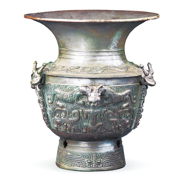 中國國家博物館收藏的龍虎紋青銅尊,高50.5厘米,重26.2千克,為一件體形較高大的盛酒器。青銅尊肩部以圓雕和浮雕相結合,塑造3條生動的蟠龍形象,龍身蜿蜒,龍首探出,額有雙角,闊吻巨口,兩眼大睜。腹部紋飾為一個虎頭兩個虎身,虎口之下有一人形,人頭銜于虎口之中?;⑸硐路揭造槔鉃榻?,飾兩夔龍相對組成的獸面。從主體花紋看,龍、虎、人造型莊嚴穩重、奇特神秘,特別是龍頭和虎頭用澆鑄法從外壁突兀凸起,雄健粗獷,比起用高浮雕法更具有一種威武逼人的悍氣。龍虎尊圓形大口表示上天,肩部神龍游蕩于空中;猛虎張牙舞爪守護大地。龍虎尊的鑄造采用十八塊母范經兩次焊接而成,渾然一體,毫無痕跡。整器工藝精湛,花紋線條洗練,是商代青銅器中的精品。