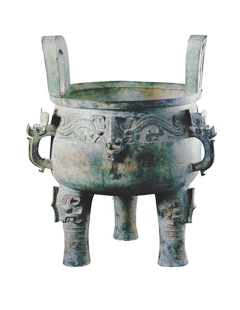 西周最大的圓鼎是陜西歷史博物館收藏的淳化大鼎,造型魁偉、深厚凝重,其造型基本保持了商代晚期胎壁寬厚、形體恢弘、凝重壯闊的風格。大鼎通高122厘米,口徑83厘米,耳高28.6厘米,腹深54厘米,重226千克,是迄今世界上最大、最重的西周青銅器,也是迄今出土的西周圓鼎中最大者。淳化大鼎因體形太大太重,除口沿上有兩耳外,器身腰部亦有三耳,形如酒器中的銴。一般的鼎,大多只有口沿耳。淳化大鼎腰部三只獸首屈舌銴,為以往出土銅鼎所未見,故又名為獸首屈舌銴鼎、獸面紋五耳鼎。除了獨特的三耳,淳化大鼎腰部的龍紋和獸面紋的結合也很有特色。三面各有兩只夔龍,與中間的扉棱組合在一起看,則形成了一張由扉棱為鼻的獸面,即饕餮紋。三張獸面的扉棱下各有一只逼真的牛首浮雕,如同饕餮欲吞食牛,起威懾之用,所以也稱牛首夔龍紋鼎、龍紋鼎等。