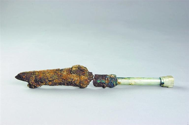 玉柄鐵劍出土于河南三門峽虢國國君虢季的墓葬,全長34.2厘米,其中劍柄長12.2厘米,劍身長22厘米。劍柄為銅芯,起到連接劍柄和劍身的作用,銅芯外鑲有晶瑩透亮的和田美玉和綠松石,并有精美的竹節(jié)飾紋,劍身和劍柄的結合處也鑲有綠松石。劍身經(jīng)由北京科技大學冶金與材料史研究所鑒定,是由塊煉法鍛制而成,劍身外有絲織品包裹的痕跡,應當是被絲織品包裹后放入劍鞘。劍鞘則由牛皮精制而成。這把玉柄鐵劍不僅制作精美,而且其利用玉、銅、鐵三種材料制作而成,是我國目前考古發(fā)掘出土的年代最早的人工冶鐵制品。它將我國的人工冶鐵歷史推前了近兩個世紀,被專家們譽為“中華第一劍”。
