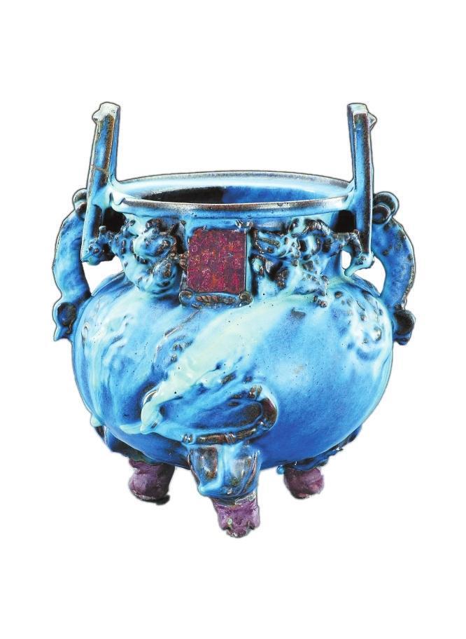 香爐整體造型為雙立耳,圓鼓腹,三獸足,體形較大。頸部雕貼三只麒麟,正面有一初方形題記,刻有“己酉年九月十五小宋自造香爐一個”共計15字,經(jīng)考證:“己酉年”是公元1309年,屬于元代中期。香爐通體施天青色釉,釉層較厚,在高溫中由于積釉濃淡不一,縱橫流淌到器表各處,形成天青、天藍、灰藍等不同釉面,再與紅褐色的露胎對比,有了銅器般的金屬質感。