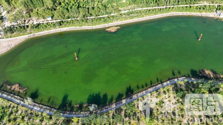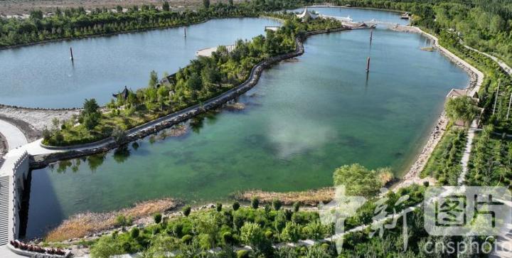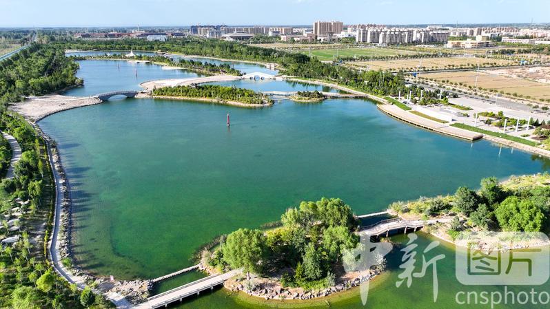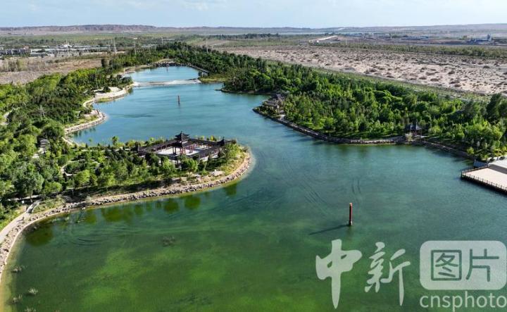2024年7月27日,航拍甘肅省酒泉市金塔縣城西生態湖,綠意盎然,生機勃勃,構成了“戈壁水鄉”的獨特畫卷。中新社發 曹紅祖 攝