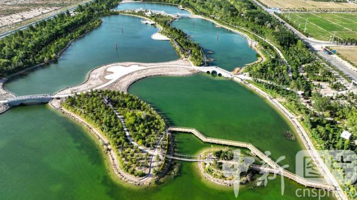 2024年7月27日,航拍甘肅省酒泉市金塔縣城西生態湖,綠意盎然,生機勃勃,構成了“戈壁水鄉”的獨特畫卷。 中新社發 曹紅祖 攝