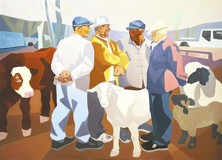 《和風(fēng)》系列作品取材于禮縣鹽官鎮(zhèn)騾馬市場逢集時交易的場景。幼時,我經(jīng)常隨父親去鹽官騾馬市場趕集,對這個場景熟悉且親切。也正因為如此,我對這個題材有著難以割舍的情愫,總是忍不住想通過畫筆呈現(xiàn)這一記憶。