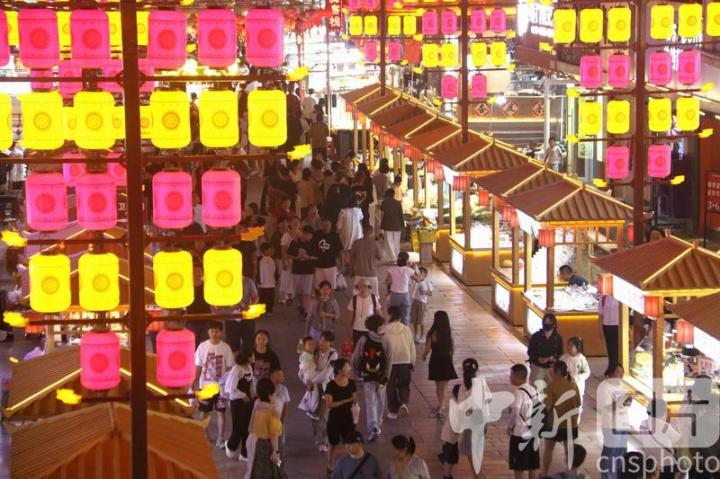 2024年8月17日,游客在甘肅省敦煌夜市游覽。進(jìn)入暑期以來,被譽(yù)為敦煌“夜景圖”的敦煌夜市日均客流量達(dá)3萬人次以上,游客在這里賞景游覽休閑,品嘗地方名優(yōu)小吃,選購敦煌特色文創(chuàng)產(chǎn)品,感受敦煌文化魅力,夜經(jīng)濟(jì)活力四射。中新社發(fā) 張曉亮 攝