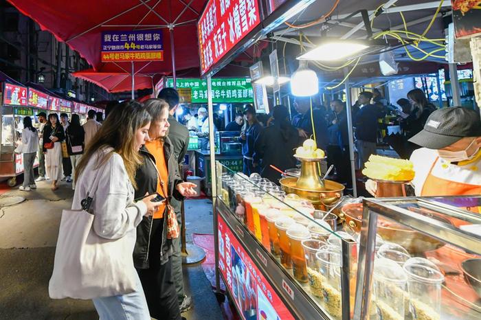 游客在蘭州市城關區正寧路小吃夜市選購特色美食。新華社記者 郎兵兵 攝