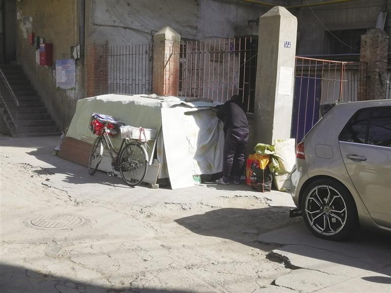 隨后,記者來到閔家橋59號(hào),破舊的小區(qū)內(nèi)堆積的雜物很多,有人堆積紙箱,有人干脆在小區(qū)院子內(nèi)“圈地”堆放私人物品。“不知道人家在堆放什么,可是進(jìn)門就能看見,很不雅觀。”居民李先生說,小區(qū)是老舊樓院,長(zhǎng)期沒人管理,衛(wèi)生環(huán)境雖然不差,但是小區(qū)內(nèi)堆積的東西太多。小區(qū)里有一個(gè)收廢品的,每天將回收來的紙箱堆積在單元樓門口,另一戶人家干脆“圈地”將自家的私人物品堆放在這里,用塑料布遮蓋起來,很不美觀。