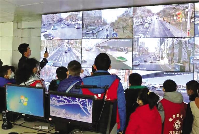 在指揮中心,民警向孩子們介紹了監控視頻,講解了電子警察的作用,并通過監控畫面詳細講解交警日常查處違法及出警派警流程。