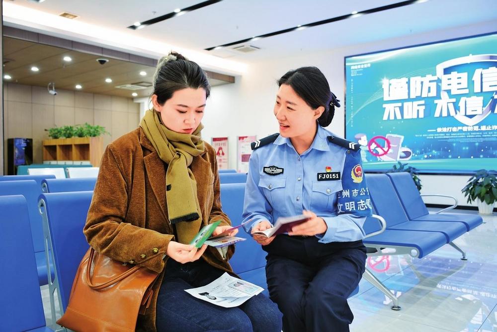 12月4日上午,蘭州市公安局出入境辦證大廳輔警方海燕向市民介紹出入境業務簡化辦理流程等事項。新甘肅·甘肅法治報記者張瑞軍攝