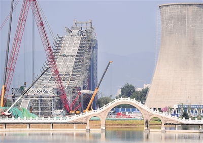 北京冬奧組委踐行節儉辦奧運,對首鋼老工業園區再利用,建成滑雪大跳臺等競賽場館。滑雪大跳臺是冬奧歷史上第一座與工業遺產再利用直接結合的競賽場館。圖為2019年7月工人在改造滑雪大跳臺。新華社記者 張晨霖 攝