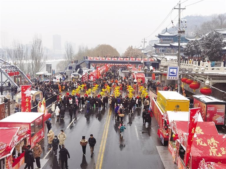 中國甘肅網2月3日訊 據蘭州晚報報道 2月2日北方小年當天,黃河市集在北濱河路白塔山公園門前熱鬧開市。現場,大紅燈籠高高懸掛、福字帳篷年味滿滿,紅柳烤肉、冰糖雪梨、糖葫蘆、糖畫、牛奶雞蛋醪糟、丁娃燒餅等特色小吃攪動著市民游客的味蕾;民間手藝人制作的非遺手工藝品、洮硯、傳統絨花做工精巧,吸引了許多人駐足欣賞;太平鼓、舞獅等表演在市場上掀起了高潮,許多市民游客上前摸摸獅子討個好彩頭,在小年這天沉浸式體驗了新春市集里的幸福煙火氣息。