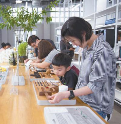 在泰國創意與設計中心圖書館,來訪者正在位于二層的材料體驗區參觀。泰國創意與設計中心圖書館供圖