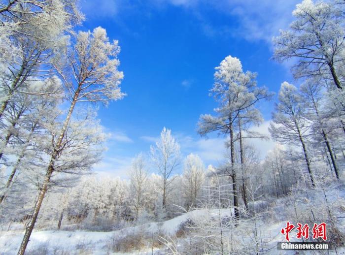 資料圖:根河市出現的大范圍霧凇將群山裝扮成了銀裝素裹的童話世界。 劉麗平 攝
