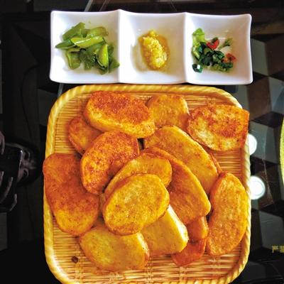 炕鍋洋芋是臨夏農家樂里面常見的一道特色小吃,在臨夏,煎、烙之類的烹飪方式都被稱作炕,炕鍋洋芋因此得名。洋芋切片后,直接放熱油中兩面煎透。炕鍋洋芋的做法雖不復雜,但其對于火候的要求卻極其嚴苛,多一分會焦,少一分則不熟。