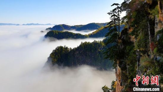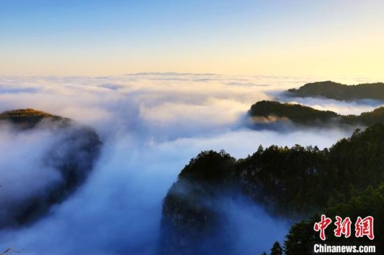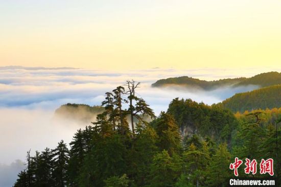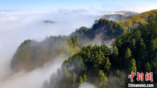 10月上旬,甘肅省定西市漳縣貴清山國家森林公園,朝陽在云層中若隱若現,云遮霧繞的景象讓層巒疊嶂的山峰成為“云端村落”,仿若仙境。漳縣貴清山國家森林公園境內原始森林遍布,森林、動植物資源十分豐富,貴清山被譽為隴中的“小華山”,是生態旅游勝地。