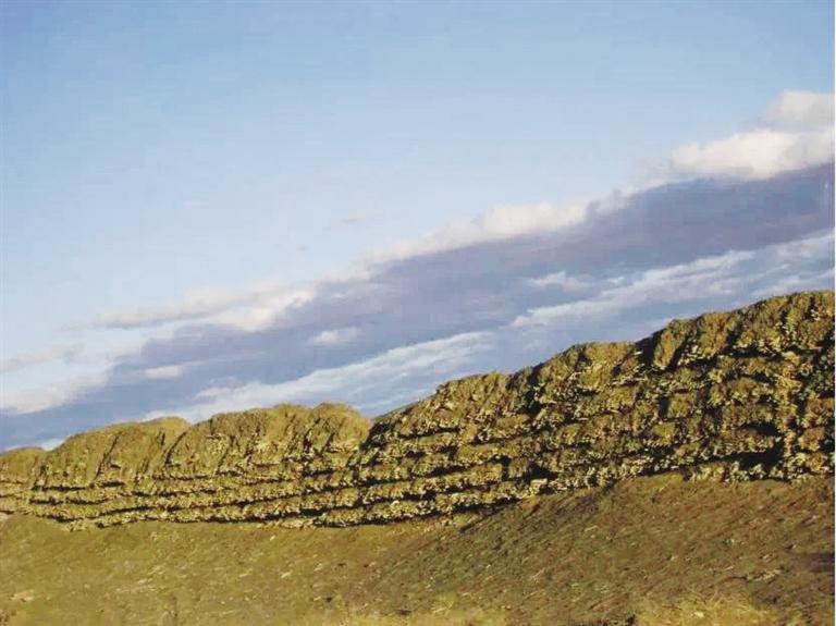 花海漢長城遺址位于玉門市花海鎮西泉村頭墩西側至二墩東側,西起三墩,東至花海頭墩,全長約3.5公里,長城基寬約2.4米,用沙石、紅柳分層夯筑,最高部分保存有紅柳7層,是河西走廊漢代長城遺址中保存較完好的地段之一。為有效保護漢長城花海段遺址,近年來,玉門市積極實施漢長城防護工程,對該段因長期遭受風力侵蝕,病險較為嚴重的長城本體進行了搶險加固,在花海鎮頭墩西側至二墩河壩間1.5公里地段內敷設了6層全封閉刺鋼絲網,并在漢長城內外兩側安裝防護欄、樹立保護標志、埋設界樁界碑,有效遏制了人為破壞,對漢長城的保護發揮了積極作用。