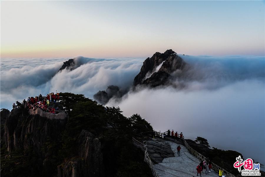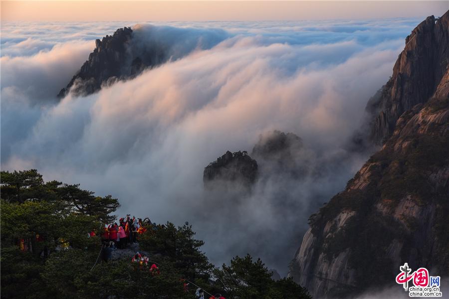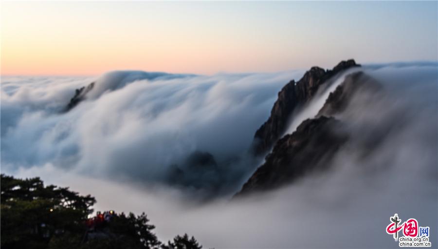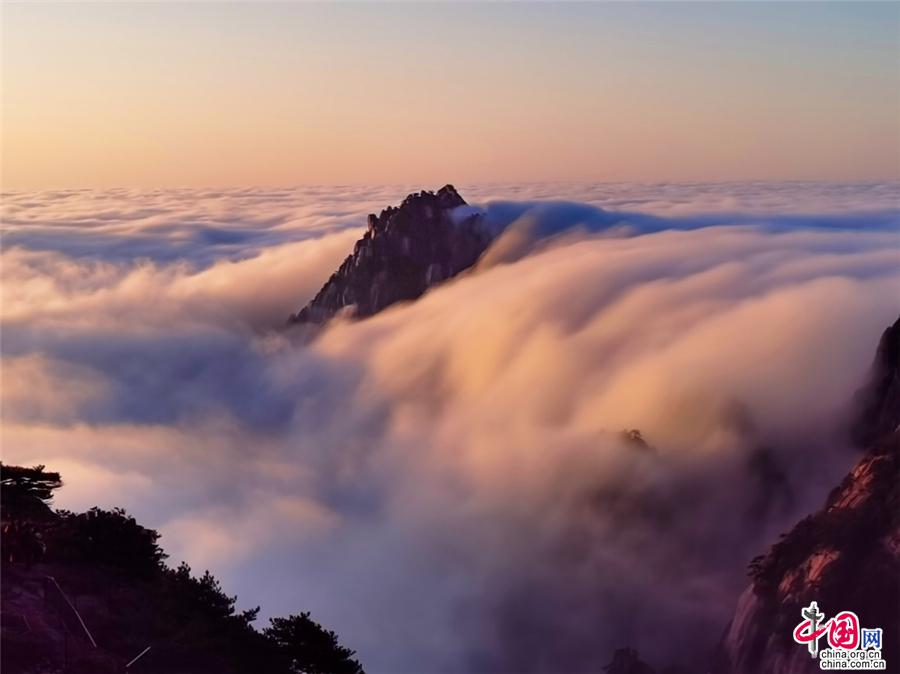凌晨,當云海隨著氣流漫過天都峰與蓮花峰時瘋狂的傾瀉而下,浩浩蕩蕩直奔東方注入大海,成就浩瀚的海洋。