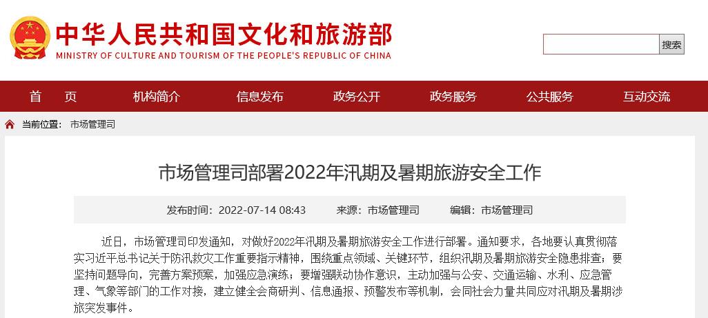 據文旅部網站消息,近日,文旅部市場管理司印發通知,對做好2022年汛期及暑期旅游安全工作進行部署。