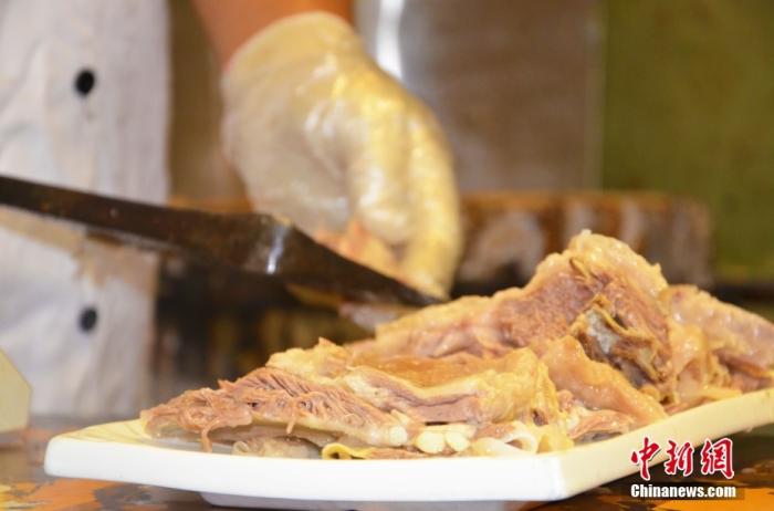 資料圖為8月12日,蘭州主城區(qū)某手抓羊肉招牌老店內,店員正在切新鮮的東鄉(xiāng)羔羊肉。 中新社記者 李亞龍 攝