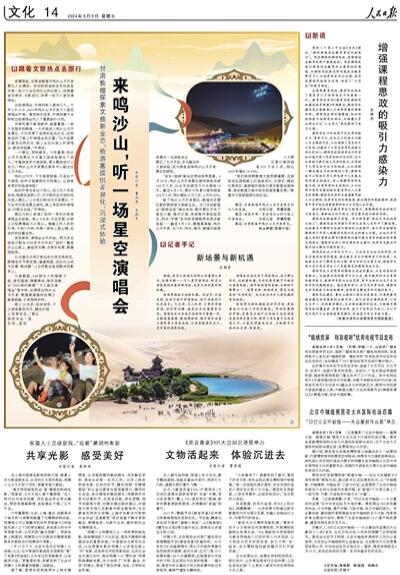 新場景造就文旅新機遇。采訪中,記者發現,這場沙漠中的演唱會,吸引游客的不僅是音樂。燈光秀、無人機秀、沙屏秀穿插亮相,炫彩熒光棒、鹿角發光發箍備受歡迎。演唱會成為當地文旅矩陣中重要一環,與敦煌莫高窟、敦煌博物館、雅丹國家地質公園等景點串連成線,讓游客獲得更多元、更豐富的游覽體驗。
