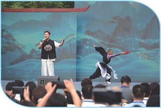 主詩會現場,氣勢恢弘的武術表演,精彩絕倫的拿手絕技,美輪美奐的崆峒山景,蕩氣回腸的武林唱響,組成一幅幅震天動地的美麗畫卷。伴著《少林,少林》《中國功夫》的歌聲,中岳武校功夫表演團數套行云流水的少林武術,豪氣干云、笑逸蒼茫,一招一式古風流存,展現出少林武者英雄豪杰的氣魄與豪邁,演繹了少林武魂的禪武精神。這些平常只能在電影或電視中才可以看到的少林武功,而今就在眼前,觀眾們紛紛報以熱烈掌聲。武與舞的“對話”,武與舞的“相遇”詮釋鐵血丹心、俠骨柔情。由平涼愛芭翎舞蹈培訓中心帶來舞蹈《王母夜宴》,通過王母夜宴的歡樂場景,將西王母和周穆王相愛的神話故事深情講說,情濃處,千回百轉,柔腸百結。一曲《刀劍如夢》穿越時空而來,歌手用獨特的嗓音,將這首歌演繹得淋漓盡致,將觀眾帶入了一個感性而深沉的氛圍,帶領我們回到了那個充滿江湖氣息的瑰麗世界。“滄海一聲笑,滔滔兩岸潮,浮沉隨浪只記今朝,蒼天笑,紛紛世上潮,誰負誰勝出天知曉滄海笑……”一曲《滄海一聲笑》,營造了一股濃濃的中國俠士逍遙風,旋律步步低落,先抑后揚,峰回路轉,觀眾隨著音樂的意象一步步陷入蒼涼和寂寥中。隨著歌曲的高跌起伏,一個個精彩的片段定格為現場觀眾一張張手機影像。