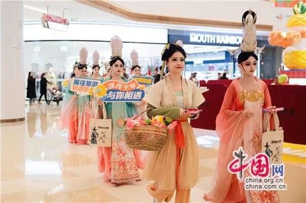 《只此周莊》劇目女主“桃兮”身著華麗的宮廷霓裳,攜宮廷舞姬、樂姬等進行了一場別開生面的互動巡游。“宇航員”“俠客”、明朝富商“沈萬三”等劇中人物走出劇場,與市民合照;宮廷器樂演繹、“入畫”舞蹈、英雄出征等節(jié)目從劇場演到商場,將宋代的繁華展現(xiàn)得淋漓盡致,市民們沉浸觀演,享受跨時空的文化盛宴。