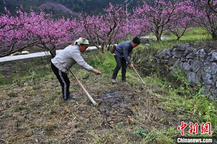 3月15日,在廣西田林縣浪平鎮浪平村,村民在桃樹下勞作。黃數情 攝