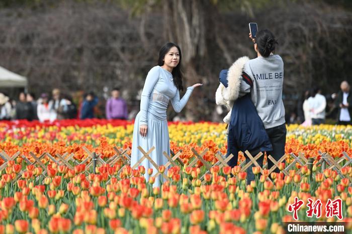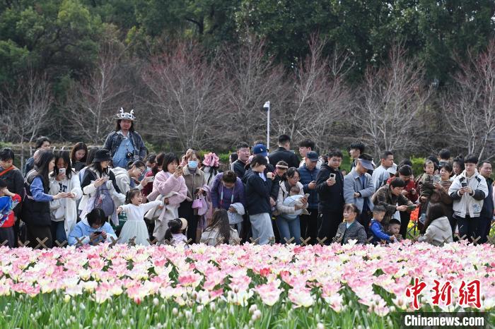3月16日,位于湖南長沙的湖南省植物園數十萬株郁金香肆意綻放,五彩斑斕的花瓣交織成一片絢麗花海,引得眾多游人紛至沓來,享受愜意春日。圖為游人置身花叢中。中新社記者 楊華峰 攝