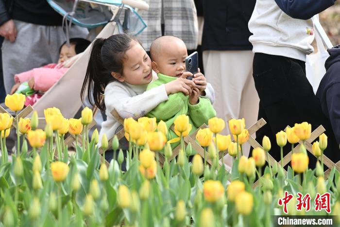 圖為姐姐教弟弟拍攝郁金香。中新社記者 楊華峰 攝